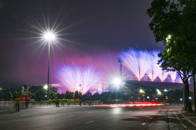 Các trận địa pháo hoa được bố trí trên mái của sân và bên trong cổng phía đường Lê Quang Đạo - Lê Đức Thọ. Khoảng 10.000 đơn vị pháo hoa,trong đó 4.600 quả tầm cao,950 giàn phun và 4.400 ống pháo hoa hỏa thuật,được sử dụng. Số lượng pháo hoa nhiều hơn khoảng 4 lần so với các sự kiện khác ở Hà Nội. Pháo tầm cao từ 110 đến 200 m,bán kính tỏa rộng nhất 150 m. Quanh khu vực khán đài B của sân là pháo hoa hỏa thuật với độ cao từ 50 đến 90 m,các giàn pháo hỏa thuật cao khoảng 50 đến 60 m.