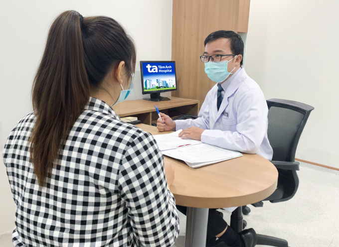 Bác sĩ Vũ tư vấn liệu trình giảm cân cho chị Xuân. Ảnh: Bệnh viện Đa khoa Tâm Anh