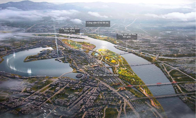 Phối cảnh tổng thể trục sông Hồng trong đồ án Quy hoạch tổng thể Thủ đô Hà Nội tầm nhìn 100 năm