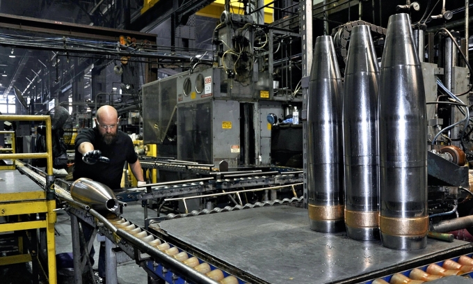 Dây chuyền sản xuất đạn pháo 155 mm tại nhà máy ở Pennsylvania,Mỹ năm 2024. Ảnh: AFP