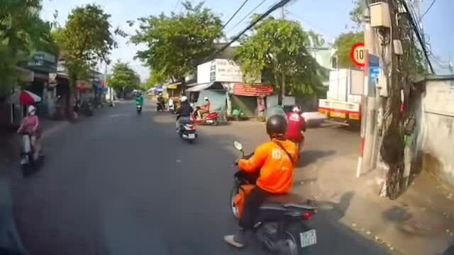 Tình huống giao thông: Chiếc xe tải chở theo nhiều thùng lớn chằng buộc lỏng lẻo di chuyển trên đường. Khi vào khúc cua,một chiếc rơi sập xuống đường,cách một người phụ nữ đi xe máy trong gang tấc.